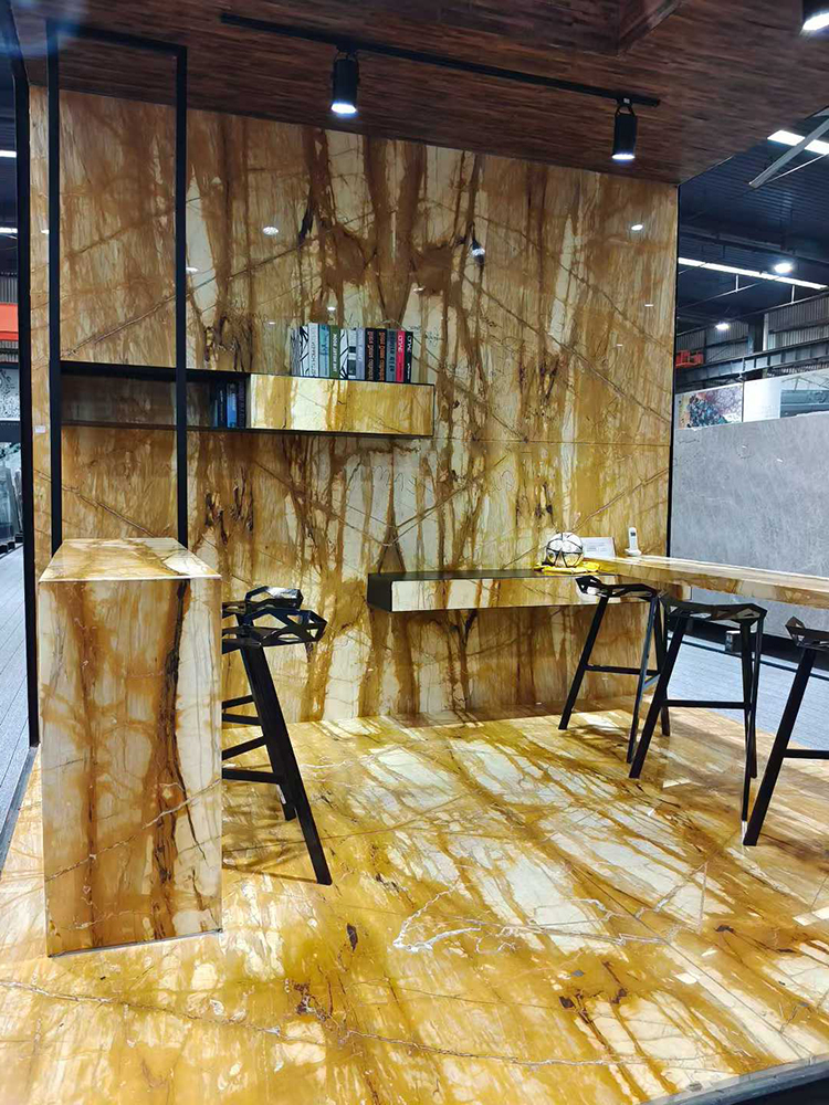ನೆಲಹಾಸಾಗಿ ಬಳಸಿದಾಗ, ಗಿಯಾಲೊ ಸಿಯೆನಾ ಅಮೃತಶಿಲೆಯು ಐಷಾರಾಮಿ ಮತ್ತು ಸುಂದರವಾದ ದೃಶ್ಯ ಪರಿಣಾಮವನ್ನು ಸೃಷ್ಟಿಸುತ್ತದೆ. ಇದರ ಬೆಚ್ಚಗಿನ ಚಿನ್ನದ ಟೋನ್ಗಳು ಯುರೋಪಿಯನ್ ಶಾಸ್ತ್ರೀಯ ಮತ್ತು ಆಧುನಿಕ ಕನಿಷ್ಠೀಯತಾವಾದ ಸೇರಿದಂತೆ ವಿವಿಧ ಒಳಾಂಗಣ ವಿನ್ಯಾಸ ಶೈಲಿಗಳಿಗೆ ಸೂಕ್ತವಾದ ಸ್ನೇಹಪರ ಮತ್ತು ಆರಾಮದಾಯಕ ವಾತಾವರಣವನ್ನು ಒದಗಿಸುತ್ತವೆ, ಜೊತೆಗೆ ಅದರ ವಿಶಿಷ್ಟ ವಿನ್ಯಾಸ ಮತ್ತು ಬಣ್ಣದಿಂದ ಪ್ರದೇಶಕ್ಕೆ ಪರಿಷ್ಕರಣೆಯನ್ನು ಸೇರಿಸುತ್ತವೆ. ಗಿಯಾಲೊ ಸಿಯೆನಾ ಅಮೃತಶಿಲೆಯು ಭಾರೀ ಪಾದದ ದಟ್ಟಣೆ ಮತ್ತು ಪೀಠೋಪಕರಣಗಳ ಘರ್ಷಣೆಯನ್ನು ನಿಭಾಯಿಸಬಲ್ಲದು ಮತ್ತು ಸವೆತ ಮತ್ತು ಗೀರುಗಳನ್ನು ತಡೆಯುತ್ತದೆ, ಇದು ವಾಸದ ಕೋಣೆಗಳು, ಕಾರಿಡಾರ್ಗಳು ಮತ್ತು ಹೋಟೆಲ್ ಲಾಬಿಗಳಂತಹ ಹೆಚ್ಚಿನ ದಟ್ಟಣೆಯ ಸ್ಥಳಗಳಿಗೆ ಸೂಕ್ತವಾಗಿದೆ.